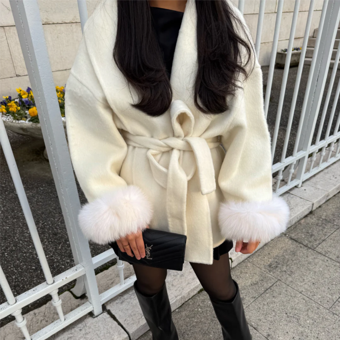Een elegante en tijdloze mantel die een vleugje luxe toevoegt aan je garderobe ✨. Gemaakt van premium wol met een zachte, gladde textuur, combineert hij comfort en verfijning in één. De afneembare faux fur manchetten geven een verfijnde uitstraling, terwijl je de look kunt aanpassen van subtiel chic naar opvallende elegantie 🤍.